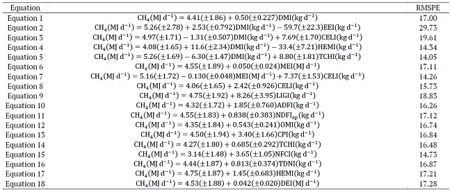 Dry matter intake and metabolizable energy intake are the variables most commonly used to predict enteric methane emission (Axelsson, 1949; Ellis et al., 2007; Johnson & Johnson, 1995; Mills et al., 2003). Although the correlation between these variables and methane emission is of low magnitude (Table 4), the prediction equations including only these variables showed low RMSPE values (Table 5, Equations 1 and 6) and are therefore adequate to predict enteric methane emission. On the other hand, Ellis et al. (2007) observed that the use of DMI in prediction equations for methane emission from cattle resulted in lower RMSPE values than equations developed from metabolizable energy intake. According to the authors, many metabolizable energy intake values were extrapolated from other information provided in the publication and are likely to contain some error compared with DMI values.