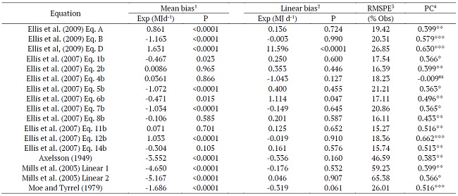 The equations described by Ellis et al. (2007) that exhibited the highest accuracy in predicting methane emission, and thus the lowest RMSPE (Table 6), were Eq. 2b, 4b, 8b, 11b and 14b (Table 2). On the other hand, the equation described by Axelsson (1949), Linear 1 and Linear 2 of Mills et al. (2003) and Moe and Tyrrell (1979) resulted in high RMSPE values and overestimated methane emission from the animals of the present study.