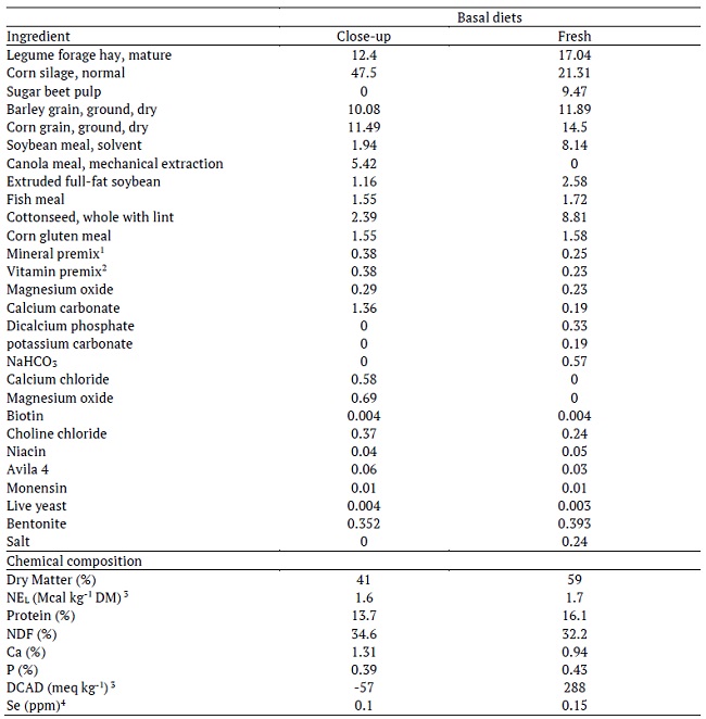 Ingredients and nutrient chemical composition of diets are presented in Table 1. The close-up and fresh diets were formulated to meet NRC (2001) requirements for 1.60 and 1.70 Mcal NEL, 13.70 and 16.10% CP, and 34.60 to 32.20% NDF per kg DM, respectively. To provide 0.30 and 0.35 mg of Se kg-1 DM in excess NRC (2001) recommendation, close-up and fresh diets were supplemented by different sources of Se.