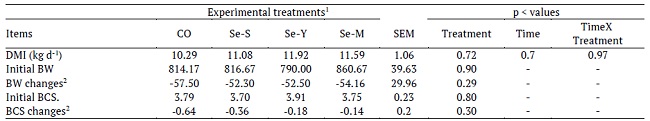 Effects of supplementation and source of Se on DMI, BW and BCS changes postpartum are showed in Table 3. Dry matter intake, BW and BCS changes postpartum were not different across experimental treatments (p > 0.05). Weiss and Hogan (2005) found no effect of supplementing different sources of se on DMI during the transition period. They reported a higher BW for supplemented cows with selenite compared to yeast Se which might be due to differences in BW at enrollment. In according to the present study results, other studies investigating the effects of dietary Se source in lactating cows did not observe any change in DMI (Heard et al., 2007; Ran et al., 2010; Salman et al., 2013; Sun et al., 2017).