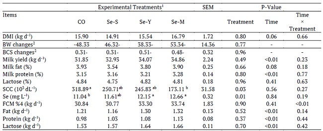 The results of present study showed that selenomethionine supplementation compared to other sources decreased SCC in transition cows. In addition, milk Se concentrations increased in Se-Y and Se-M groups more significantly compared to the Se-S group. This indicates that organic Se (especially selenomethionine) had better replace inorganic Se for transition dairy cows.