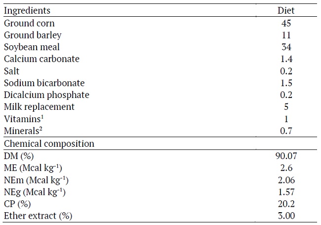 The protocol for animal experiments was approved by University of Agricultural Sciences and Natural Resources, Gorgan, Iran. Calves were removed from the dam within 20 to 30 min of birth before suckling could occur. To be eligible for enrollment, calves had to be singletons, weight from 40 to 45 kg, similar median calving ease score 3 (1 to 5 scale), and have similar median parity of dam. Forty male newborn Holstein calves were fed either unheated (n = 20) and heat-treated colostrum (n = 20), 10% of their birth weight. During first 24h, calves received colostrum 4 L, within 1 to 2h after birth and residual was fed 6h after birth. Systematic, rather than random, assignment to treatment groups was used to ensure that the age (duration of storage) of heat-treated and unheated colostrum was approximately equal at the time of feeding, because the storage period will allow for bacterial growth in colostrum. After assignment to a colostrum feeding group, the appropriate bottle of colostrum (heat-treated or unheated) was removed from refrigerator and warmed approximately to 39°C. During the days 2 and 3, calves were fed pasteurized milk 2 L at 9 AM and 2 L at 6 PM. Milk feeding program during days 4 to 63 (9 weeks) was 4, 4, 5, 7, 7, 7, 5, 2 and 1 litter per each day which except week 9, calves were fed just 1 L in the morning and half of milk was received in the morning and residual was fed in afternoon. The composition of the diets is presented in Table 1. Solid feed (starter) was offered ad libitum to all calves after d 3. During the research all the calves receive same amount of milk in the milk feeding program.