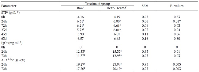 Apparent efficiency of absoption (AEA, %) of IgG at 24 and 72h of life was also greater for calves fed heat-treated colostrum (23.94 and 20.19%) vs. calves fed unheated colostrum (19.29 and 17.50%) (Table 3). AEA (%) of IgG, a calculated measure that estimates what proportion of the total IgG mass fed is actually absorbed into the calf’s circulation, was calculated using the equation described by Quigley III and Drewry (1998), assuming a plasma volume of 8.5% of birth weight. By increasing serum IgG concentration in calves fed heat treated colostrum and reduction in total plate count during this process, AEA in calves fed heated colostrum had been increased and it was due to rising binding sites for absorbing IgG in gut and it was approved by authors hypothesis.