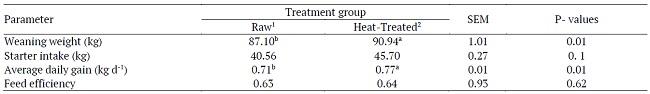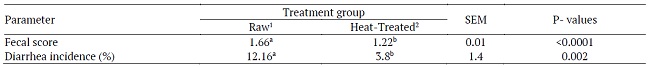 According to the results (Table 5), weaning weight (63d) was greater for calves were fed heated colostrum vs. unheated colostrum (90.94 vs. 87.10 kg; p = 0.01). Average daily gain was significantly greater for calves fed heat-treated colostrum vs. unheated colostrum (0.77 vs. 0.71 kg d-1; p = 0.01) (Table 5). Whereas there were no differences in starter intake and feed efficiency between two groups (Table 5). Colditz (2004) reported calves with failure of passive transfer also had lesser weight gains likely because of decreased nutrient utilization and reduced feed intake associated with more disease in these calves compared with calves with adequate passive transfer. Berge, Besser, Moore, and Sischo (2009) demonstrated calves with greater serum IgG concentration had a significantly greater average daily gain to 28d of age. In an other research, Yang, Zou, Wu, Li, and Cao (2015) shows calves that receive colostrum and According to aforementioned researches and ours research results, calves with heated colostrum by having more serum IgG concentration have more average daily gain and body weight versus calves fed unheated colostrum. In contrast, Elizondo-Salazar and Heinrichs (2009a) reported feeding heated colostrum in 60°C for 30 min had no differences among treatments in body weight and feed intake from birth until 8 weeks. In the present study calves birth weight, median ease score and median parity of dam were same between heated and unheated groups (Table 2). In addition, the average daily gain and weaning weight in the heat-treated clostrum were greater, while feed intake was not significantly different between the two groups. It seems that increasing the performance in heat-treated calves is due to an increase in the immune system and a reduction in the mortality (Tables 3, 4).