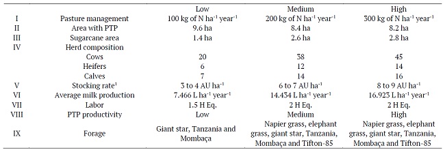 After monitoring and analyzing the family farming establishments dedicated to milk production in the region, technical and animal indicators of milk production were obtained. Then, based on the categorization and technologies recommended by the IAPAR, three milk production systems were defined, classified according to pasture management - specifically, low, medium and high technological standards - whose characteristics are described in Table 2.