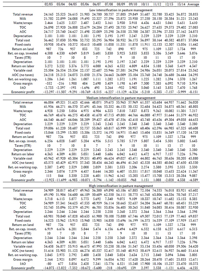 Table 3 presents the results of analyzing the profitability of dairy farming in production systems with low, medium and high intensities of pasture management between the years 2002/03 and 2013/14.
