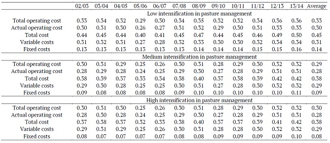 Table 4 presents the costs of producing one liter of milk, in accordance with the technological level adopted, in the Caiuá sandstone region in Northwestern Paraná between the agricultural years 2002/2003 and 2013/2014. As a rule, the system with a low technological level presented higher costs, mainly due to the economies of scale and scope of the other systems.