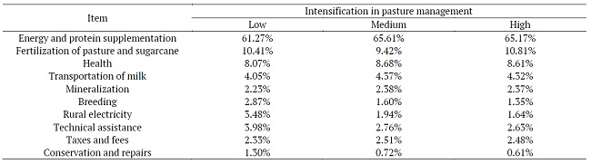 Regarding expenditures on animal breeding, rural electricity, conservation and repairs and technical assistance, the systems presented expenditures on these components that were inversely proportional to the technological level adopted, i.e., as the intensification of pasture management increased, their share of the AOC decreased.