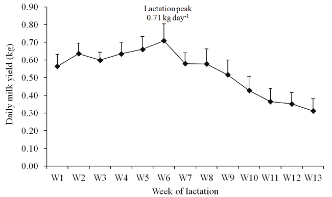 During early lactation, the mean of DMY was 0.56 ± 0.06 kg and the individual values varied between 0.10 and 1.36 kg. Daily milk production increased from the 1st to the 6th week post-partum, which corresponds to the peak of lactation (0.71 ± 0.09 kg), and then it decreased significantly (0.31 ± 0.07 kg) until the 13th week (p < 0.01). Older goats, 6 to 8 years old, produced 43.5 % more milk than 2 years old goats (0.85 ± 0.60 vs 0.48 ± 0.37 kg). Moreover, goats giving birth to twins produced 25.9 % more milk than those kidding singles (0.72 ± 0.20 vs 0.53 ± 0.06 kg).