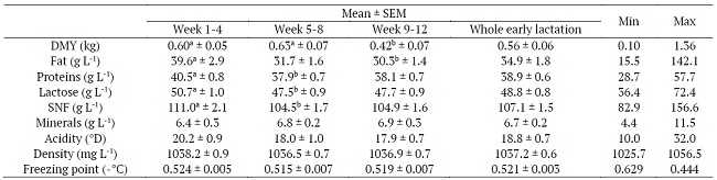 Mean rates of fat, proteins, lactose and SNF were respectively 34.9 ± 1.8, 38.9 ± 0.6, 48.8 ± 0.8 and 107.1 ± 1.5 g L-1. The concentration of fat dropped by 54.8 % from the 1st (66.5 ± 15.4 g L-1) to the 3rd week post-partum (30.0 ± 1.7 g L-1), then stabilized for the rest of early lactation period. Proteins, lactose and SNF rates were the highest in the 1st week post-partum (44.7 ± 4.0, 55.9 ± 4.9 and 122.1 ± 10.0 g L-1 respectively). They decreased through the 1st month of lactation before stabilizing in the two next months. The average concentration of minerals remained relatively stable throughout early lactation; it ranged between 5.9 and 7.6 g L-1 with a mean of 6.7 ± 0.2 g L-1.