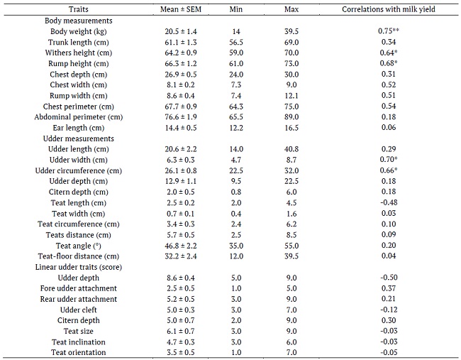 Characteristics of body and udder morphology of lactating goats and their correlations with milk yield are summarized in Table 2. Mean goats’ body weight was 23.2 ± 1.5 kg on the day of parturition. It decreased significantly (p < 0.01) to 20.5 ± 1.4 kg during early lactation, which corresponded to a loss of 11.6 % of initial body weight. Most of the goats had a globular udder with a funnel or bottle teat shape. Non globular udders and cylindrical shaped teats were less frequent (three and two goats respectively). Except two goats, the others presented a soft udder texture. Supernumerary teats were present in five goats.