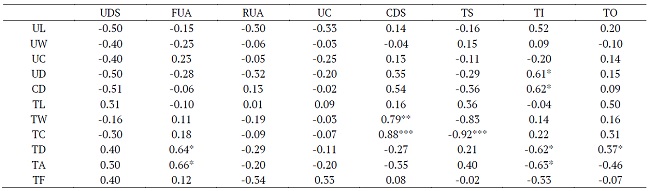 Results of correlation between udder measurements and linear udder traits are shown in Table 3. The higher correlation coefficient was found between teat size and teat circumference (r = -0.92, p < 0.001). Fore udder attachment was significantly correlated with teats distance and teat angle (p < 0.05) and citern depth score was significantly correlated with teat width (p < 0.01) and teat circumference (p < 0.001). Teat inclination was significantly correlated positively with udder and citern depths and negatively correlated with teats distance and teat angle (p < 0.05). Teat orientation was also significantly correlated with teats distance (p < 0.05). Correlations between udder and citern depths and their scores were not significant (p > 0.05) despite the relatively high correlation coefficients (-0.50 and 0.54 respectively).