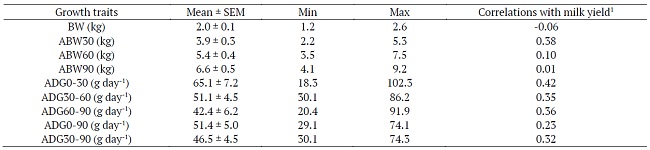 Bedouin kids’ performances and their correlations with milk yield are given in Table 4. The mean kids’ birth weight (BW) was 2 ± 0.1 kg. They grew at a rate of 51.4 g day-1 during early lactation to reach a final weight of 6.6 kg at the 90th day. The highest growth rate was recorded for ADG0-30 followed by ADG30-60 and then ADG60-90 but no significant difference was noted between these traits (p > 0.05).
