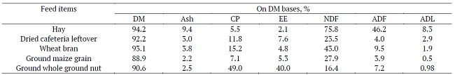 The chemical composition of feeds is given in Table 2. Among the different concentrate feeds higher value of crude protein (CP) was obtained in Ground Whole Groundnut (GN) than maize grain (MG), Cafteria Lefet over (CL) and wheat bran (WB). Moreover, higher value of fat is recorded on GN than wheat bran (WB). However, higher ADL values were noted in hay and CL.