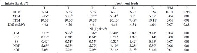 Hay dry matter intake of bulls (HDMI) was similar (p > 0.05) across the treatment groups. However, concentrate dry matter intake (CDMI) and total dry matter intake (TDMI) were affected by treatment groups. The CDMI of Bulls in T6 was highest (p < 0.001) than did in T5 and T2, respectively. However, similar CDMI intake was noted in T6, T1, T3, T2 and T4 (Table 3). Likewise, TDMI were highest (p < 0.001) in T6 > T4 > T3 > T1 > T2 as compared to T5. Daily nutrient intake was also affected by treatment groups. Accordingly, bulls in T5 had lowest (p < 0.001) organic matter intake than did in T6 > T4 > T3 > T1 > T2. Conversely, highest crude protein (CP) and ether extract (EE) intake were recorded in bulls fed T5 than rest of treatment groups.