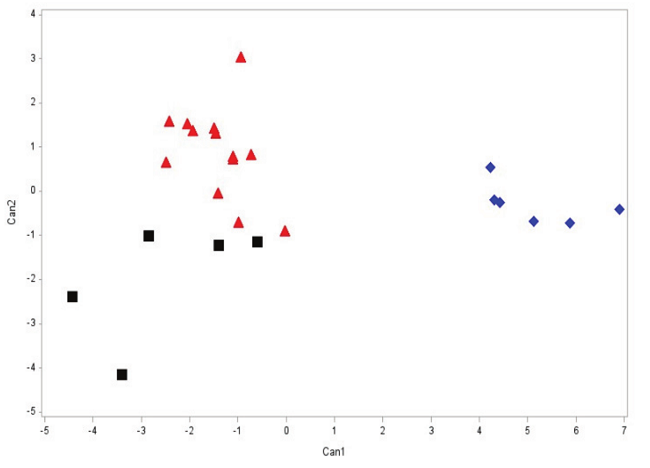 The clustering analysis was performed using PROC FASTCLUS to form groups of observations that presented similar characteristics within the group, and differences with the other groups. In order to achieve this, we used the Ward's hierarchical method based on the Euclidean distance to estimate the means of the groups. Then, the discriminant analysis was performed through PROC DISCRIM, in order to correctly classify the observations within each group, and the PROC STEPDISC, using the STEPWISE method aiming to identify the variables responsible for group differentiation. The canonical discriminant analysis (PROC CANDISC) was used to graphically demonstrate the distances within and between groups. For these analyzes, the assumptions of multivariate normality and homogeneity of the covariance matrix were tested and met. In this way, the observations were correctly distributed within their respective groups when verified by the Fischer linear discriminant function, using the algorithm of the k-nearest neighbor (KNN).