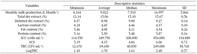 The descriptive statistics of the data set evaluated are presented in Table 2, as well as the transformations for the SCC and TBC, that adopted the following methodologies: (somatic cell score - SCE= (log 2 (SCC/100)+3) (Ali & Shook, 1980) and logarithm with base 10 (log10) (LogTBC), respectively. Subsequently, the data were evaluated using multivariate analysis techniques (factor analysis and clustering), using SAS® statistical software (Statistical Analysis System [SAS], 2000).