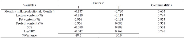 The second factor represents the positive relationship between SCS and LogTBC, which have a negative effect on monthly milk production, as well as on profitability when payment programs based on milk quality are adopted (Busanello et al., 2017a). Busanello, Rossi, Cassoli, Pantoja, and Machado (2017b) studied the prevalence and incidence of subclinical mastitis in 517 Brazilian herds. They found high values for these indicators (46.4% and 0.17 new cases/cow at risk/month, respectively). In addition, these values did not improve over their study period, highlighting the need to establish large-scale milk quality programs in Brazil. Therefore, the high commonalities for the variables in our study demonstrate the importance of these variables in the monitoring and evaluating the milk quality and herd’s health.