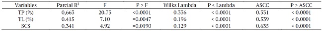 According to Dillon, Hennessy, and Cullinan (2015), the SCS can influence milk production. In a study conducted in Ireland from 2008 to 2011, these authors found that approximately 30% of the herds had a mean SCS above of 300,000 cells mL-1. In addition, when comparing herds with 400,000 cells mL-1 with the ones with 300,000 cells mL-1, a 2% reduction in productivity was verified. Although not statistically significant, it considerably reduced the annual profitability of milk producers. Afterwards, we applied the discriminant analysis. This analysis selected the variables that were determinant in the differentiation of the groups formed by the cluster analysis (Table 4). These variables were protein content, lactose content and SCS. All the determinant variables were considered, and the partial R2 explains how much each variable represents in the differentiation of the groups. Thus, 66.3% of the distance between the groups is explained by the milk protein content, 41.5% by the lactose content and 34.1% by SCS.