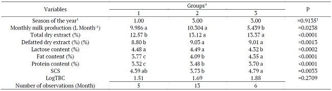 Three groups of observations were formed from the cluster analysis (Table 5), and they were evidenced by the canonical discriminant analysis that graphically demonstrated the Euclidean distances used in the separation between and within the groups (Figure 1). Groups 1 and 2 differed for TDE, DDE, fat and protein content, whereas groups 2 and 3 differed for monthly milk production, lactose, fat and protein content, and SCC (Table 5). Groups 1 and 3 differed for milk production and milk composition, except for SCC. The variables for season and LogTBC did not differ for the groups formed. However, it is noteworthy that the group 1 was a reference to warmer months, whereas 2 and 3 referred to colder months.