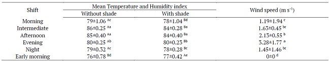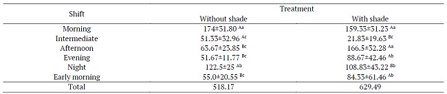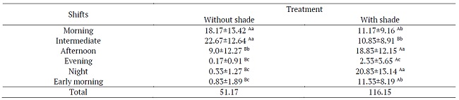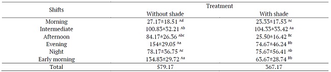 The experimental design was completely randomized. To better analyze the data, six shifts were considered per day: morning (6:00 to 9:55 a.m.), intermediate (10:00 a.m. to 1:55 p.m.), afternoon (2:00 to 5:55 p.m.), evening (6:00 to 9:55 p.m.), night (10:00 p.m. to 1:55 a.m.), and early morning (2:00 to 5:55 a.m.). Comparison of means (Tukey at 5% probability) was calculated for behavioral and climatic variables using the Statistical Analysis System (SAS, 2004) v. 9.1.2 software to verify the effect of treatment (sun and shade) and shifts (morning, intermediate, afternoon, evening, night, and early morning).