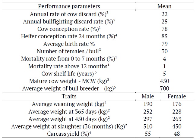 The performance parameters (Table 1) used for model fit were based on the production system of the center region of Brazil and on literature review because bio-economic models require certain information that is not evaluated in many production systems, a fact that can make the bio-economic model fit more difficult. According to Campos et al. (2014) the bio-economic model evaluated in different studies may not necessarily represent other complete-cycle production systems of beef cattle breed. However, these authors remind that it is possible to adapt the model to study other production situations that are similar. It was possible to estimate the feed cost centers according to forage, mineral and protein supplement requirements, as well as revenues from the sales of males and females at 36 months, sires, and culled cows based on the information about the composition and evolution of the herd in each animal category (Table 4).