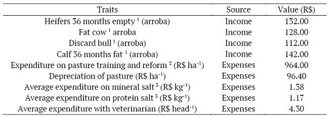 The sources of expenses and revenues (Table 2) were calculated for the animal categories of interest in the study. Expenses were derived from the costs of feeding and pasture that included expenses for formation, maintenance and annual depreciation, costs for annual protein-mineral salt supplements, and annual veterinary costs. The sources of revenues of the system were based on the sale of culled cows and bulls (weight of 450 and 700 kg, respectively), as well as of 36-month-old steers and heifers that were not reintegrated into the herd (weight of 510 and 450 kg, respectively). The revenues from animals destined for slaughter was described for two situations. In the first situation, the payment was based on the value paid per arroba (unit of weight) in each category. In the second situation, the payment was based on quality in which the use of improved bulls in the mattings can promote the growth of animals of better weight and carcass conformation.