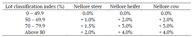 The differential payment of the second situation (Table 3) was made within the Natural Nellore quality program which farmers had the opportunity to receive bonus payments from the slaughterhouse that can reach up to 4% of the value of the arroba of the animals. The profile necessary for the animals to receive the bonus in the steer category is a mean hot carcass weight of from 255 to 328 kg, with distribution of carcass fat ranging from 3 to 10 mm in a regular conformation score (rectilinear, sub convex, convex). Castrated males in the batch must have up to 6 permanent incisors, while uncastrated males must have all deciduous teeth. In the heifer category, females must have up to four permanent incisors and a mean hot carcass weight higher than 13 arrobas, with the same fat and carcass pattern as described for steers. The category of cows classified in the bonus batch requires a mean hot carcass weight higher than 15 arrobas (≥ 225 kg), with the same finishing fat cover and carcass pattern as described for the other categories.