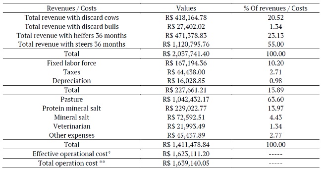 The more important factor in the sale of 36-month-old males and females in revenue sources (55% and 23%, respectively - Table 4) was the highest amount of live weight, in agreement with results found in the literature for the same type of production system (Campos et al., 2014). Pasture costs accounted for 63% of the expenses of the system, a fact explaining this source of feeding to be the most exploited by the system. When the pasture lost its nutritional quality because of seasonality, protein supplementation became the alternative source so that the animals would not lose weight. These costs accounted for approximately 14% of the annual costs of the system.