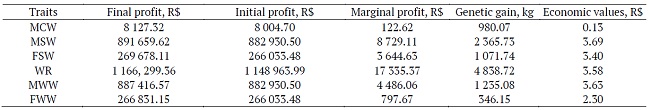 Classification of the traits according to economic importance considering the difference in profit before and after the simulation of improvement (marginal profit) showed that WR had the greatest economic impact on the full-cycle system followed, respectively, by MSW, MWW, FSW, FWW and MCW (Table 6). The same was observed by Urioste, Ponzoni, Aguirrezabala, Rovere, and Saavedra (1998), Jorge Júnior et al. (2007) and Brumatti, Ferraz, Eler, and Formigonni (2011) who reported that any positive increase in WR had favorable economic impacts for production systems for sale of animals at slaughter. However, Brumatti et al. (2011) verified greater impact from carcass and fertility traits than weight and weight gain traits. Campos et al. (2014) found that number of calves weaned showed the greatest impact on the profit of the production system in Aberdeen Angus cattle. This order of importance was also observed when it was simulated 1% increase on genetic gain for the studied traits, with WR had the greatest genetic gain in the full-cycle system. However, in contrast to marginal profit, MCW was the fifth most important trait in terms of genetic gain, thus surpassing FWW.