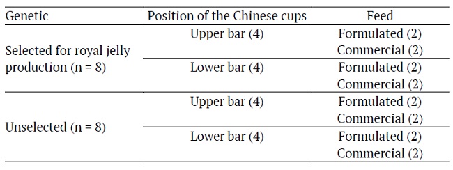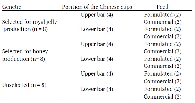 Trial I: A total of 24 mini-hives colonies with queens selected from colonies strains selected for honey production, royal jelly and without selection, two types of cups, conventional acrylic and Chinese model, two types of feed, one commercial (BeeFood®) and another formulated according to Sereia et al. (2010a) with adaptation, totaling 12 treatments (Table 1).
