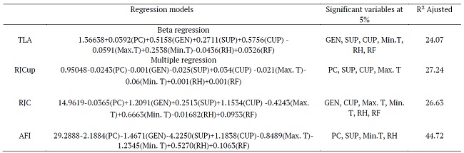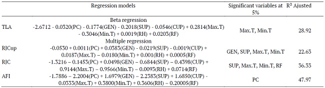 The data were analyzed using the statistical software R Development Core Team (R, 2018) with beta regression for cup acceptance variables and multiple regression to explain the other variables. Means were compared by Tukey’s test with significance level of 5%.