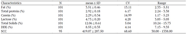 Table 1 presents a descriptive analysis of the milk’s physical-chemical characteristics and SCC. The SCC presented a high coefficient of variation which indicated great variability of this count in the analyzed samples. Among the milk components, fat and casein had the highest coefficients of variation. The components that showed the lowest variation were lactose, total protein and DDE. The variation source of these components may be genetic, physiological and environmental, and therefore are very variable (Machado, Pereira, & Sarríes, 2000).