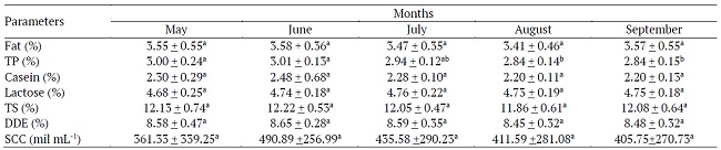 Total protein levels in the months of August and September were lower than May and June (Table 2). No variations were observed during the evaluated period for the components fat, casein, lactose, total solids and defatted dry extract (Table 2), which is compatible with the results found by Silva et al. (2016) in herds of the same region.