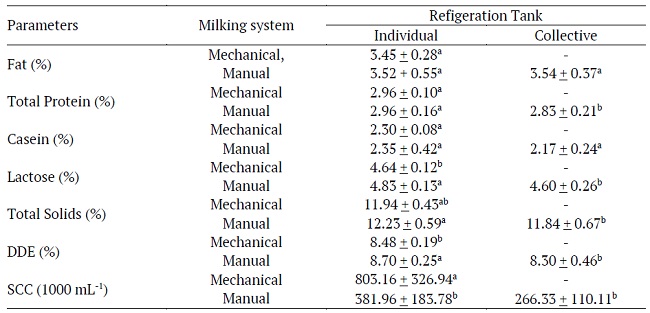 Storage tanks and different milking systems influenced the concentrations of total protein, lactose, total solids, defatted dry extract and SCC. The milk from individual tanks with manual milking (ITMA) presented a higher total protein and total solids (p < 0.05) than that stored in collective tanks with manual milking (CTMA), and similar to individual tanks with mechanical milking (ITME) (Table 3). The milk samples from collective CTMA and ITME presented similar DDE percentage to each other and lower than ITMA.