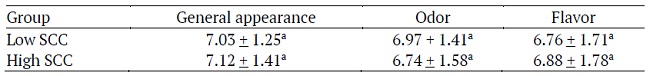 Milk cooling tanks were classified as low SCC (less than 200,000 cells mL-1) and high SCC (greater than 800,000 cells mL-1) from the SCC results, and the respective samples were pasteurized (72°C/15 s). The milk was then stored under refrigeration until sensory evaluation.