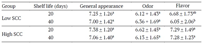 On the other hand, the coalho cheese samples (Table 5) presented similar values for the appearance and odor attributes. Only cheese with low SCC at 40 days of shelf life presented a significant difference (p < 0.05) for the flavor, with a lower value (6.05-slightly liked) when compared to cheese samples with high SCC (moderately liked). Flavor changes are probably due to lipolysis and proteolysis which became more intense over the storage period, thereby producing undesirable flavors and low sensory acceptance, as observed in pasteurized milk by Ma et al. (2000) and in prato cheese by Vianna et al. (2008).