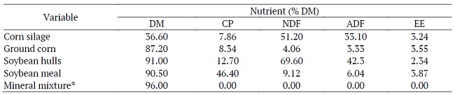 Heifers were kept in feedlot facilities consisting of collective 10 × 7.7-m2 stalls equipped with collective troughs measuring 1.15 linear meters per animal and automatically refilled drinkers. At the onset of the experiment, the animals were weighed post-fasting, dewormed, and acclimated to diets and facilities for 14 days before the actual commencement of the trial, which lasted 97 days, totaling 112 days. Diets were formulated in accordance with the requirements suggested by the NRC (2000), to provide an estimated average weight gain of 1.2 kg day-1. The feed consisted of 90% concentrate plus 10% corn silage as the only roughage source (Table 1). The concentrate was composed of ground corn, soybean hulls (in mash form), soybean meal, and a mineral mixture, and was supplied along with the roughage twice daily, in the morning and in the afternoon (07:00h and 17:00h, respectively).