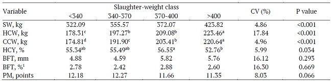 The experiment was set up as a completely randomized experimental design with four treatments (weight classes). Data were subjected to analysis of normality and homogeneity of variances. After these assumptions were met, the data were subjected to analysis of variance, with differences between the means detected by Tukey’s test at α = 5%, using SAS statistical software (Statistical Analysis System [SAS], 2004). The following mathematical model was applied: