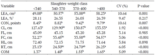 Among the main characteristics associated with muscle development in the carcass are conformation, LEA, round thickness, and fore-leg circumference. Loin-eye area, which is the most commonly used objective measurement, increased (p < 0.05) with the increasing slaughter weights (Table 3), and the correlation between these variables was 0.62 (p = 0.001). However, when LEA was expressed relative to 100 kg of LW, this difference was no longer present. Round thickness and fore-leg circumference, which are also estimates of tissue development, also raised with the slaughter weight. The correlations between these two variables and slaughter weight were 0.65 and 0.63 (p = 0.001), respectively. Rodrigues et al. (2015) described that round thickness was similar (p = 0.5204) across the different slaughter-weight classes of cull cows, with values ranging between 25.9 cm (heavy) and 24.9 cm (light). The authors argued that although HCW and conformation were distinct between the slaughter-weight classes, these differences were not sufficient to change the objective measurement of carcass muscularity. In this way, the animals slaughtered at a weight heavier than 400 kg showed better (p < 0.05) conformation than those in the other weight classes, which did not differ from each other (Table 3).