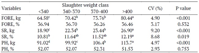 The absolute weight of the primal cuts forequarter, hindquarter, and short ribs increased (p < 0.05) as the slaughter weight was increased, indicating a proportional development of those cuts with LW at slaughter (Table 4). Considering that the weight of primal cuts is clearly influenced by the LW of the animal, this variable is better assessed when expressed as a percentage of the carcass weight. Thus, when the weights of the forequarter and hindquarter cuts were expressed relative to 100 kg of cold carcass, this difference ceased to exist (p > 0.05).