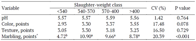 Meat color and texture were determined subjectively after 24h of carcass chilling, on a transverse section of the Longissimus dorsi made at the 12th rib of the left half of the carcass, after exposing the muscle to constant oxygenation and luminosity for 30 min. The color was classified on a scale of 1 to 5 (1 = extremely dark meat; 5 = extremely light meat). Texture was assessed based on the granulation of muscle fiber bundles on the exposed surface of the sectioned muscle, with scores ranging from 1 (extremely thick) to 5 (extremely fine) (Müller, 1987). The final pH of the carcass was determined at the Longissimus dorsi muscle from the left half of the carcass, using a digital pH meter 24h after the carcasses was chilled in a cold room at 0 ± 1ºC.
