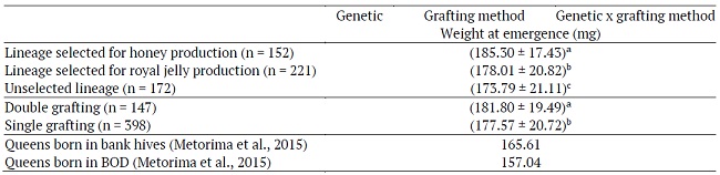 The mean queen weight at emergence for each lineage, according to the grafting method is listed in Table 1. There was statistical difference for the parameter weight at emergence for lineage and grafting method.