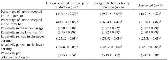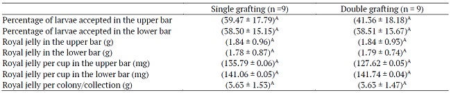 Table 3 lists mean values for percentage of accepted larvae, royal jelly per bar, royal jelly per cup and royal jelly per colony/collection according to the method by which queens were produced. There was no difference (p > 0.05) for any of the analyzed parameters.
