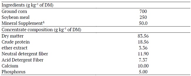 For this study, the cows were submitted to oestrus synchronization and artificially inseminated at fixed time. After 30 days, the pregnancy diagnosis was performed by trans-rectal ultrasonography. Fifteen pregnant animals with 4 ± 1 years of age, and body condition score (BCS) of 7 ± 1 and live weight of 400 ± 50 kg were selected. During the experimental period, the cows remained in paddocks with an area of 8 hectares, formed by pastures of Panicum maximum cv. Mombaça and Brachiaria brizantha cv. Marandu and Xaraés. In the late afternoon, the cows were collected to provide concentrated supplementation (ground corn, soybean meal and mineral supplement - Fosbovi 20®, Tortuga, São Paulo, Brasil) based on dry matter (Table 1), once daily in a collective trough at the rate of 2 kg for each animal.