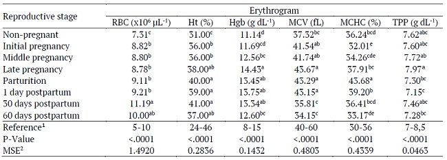 The erythrogram was influenced (p < 0.001) by the reproductive stages, with variation in the results obtained for the total red cell count, hemoglobin content, globular volume, MCV, MCHC and TPP (Table 2). A high number of red blood cells were observed in the immediate postpartum period (11.19 x 106 uL) compared to the other stages.