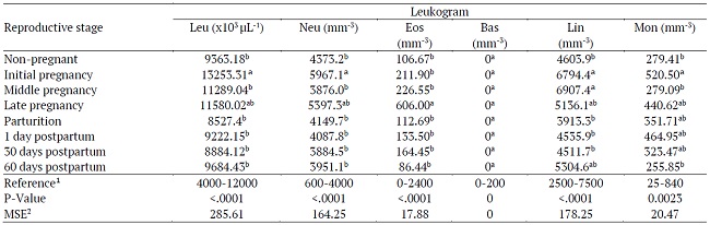 The hematocrit differed (p < 0.001) among reproductive stages, with lower (31%) and higher (41%) percentage in non-pregnant cows and cows in the first month of postpartum, respectively. The hemoglobin levels were influenced by the reproductive stage (p < 0.001) with high values in the final third of pregnancy.