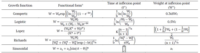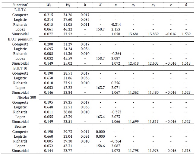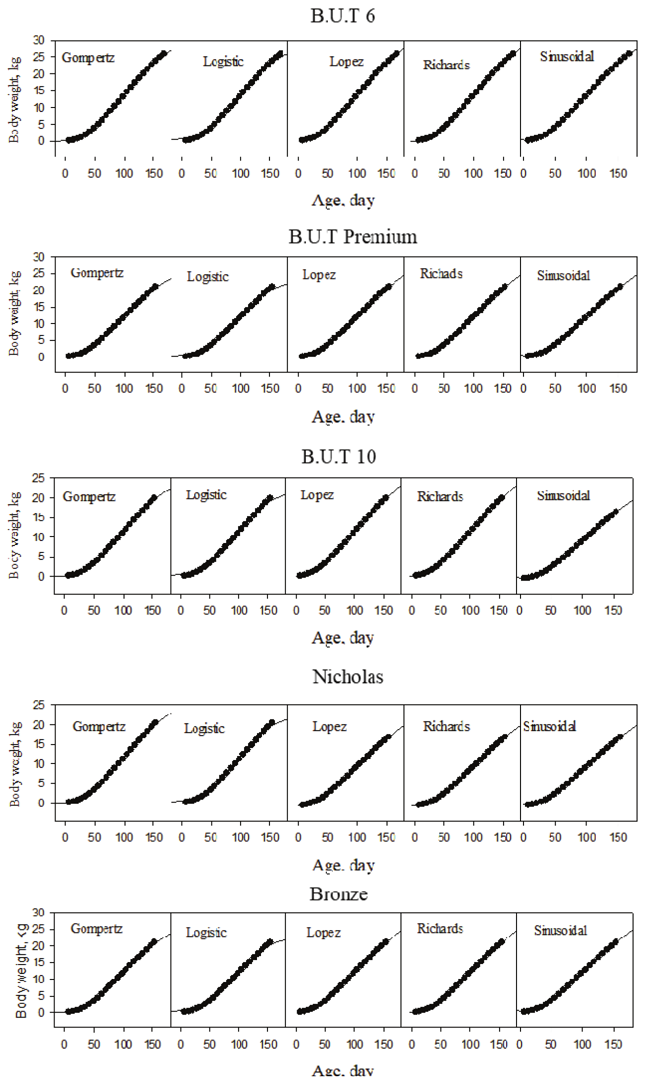 The functions used to describe the growth curves of turkeys are presented in Table 1. The Gompertz, logistic, Lopez, Richards and sinusoidal equations were fitted to the data to model the relationship between body weight and age.