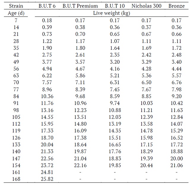 Five time course profiles (Table 2) from the Management Handbook of Aviagen (2013) were used in this study to investigate the relationship between BW and age in different male strains of turkeys.