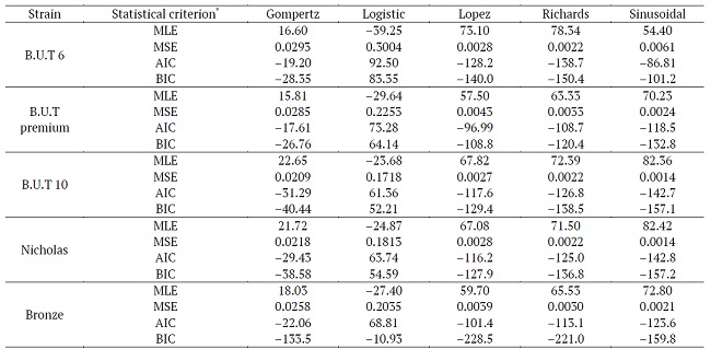Comparison of the growth functions based on their behaviour (Figure 2) showed that, with exception of the logistic, the other functions gave a suitable fit to the data profiles. Here, the interesting choice lies between the sinusoidal and Richards equations. Based on maximized log-likelihood, MSE, AIC and BIC criteria and depending on the strain, the sinusoidal equation showed superiority over the other growth functions (Tables 3 and 4).